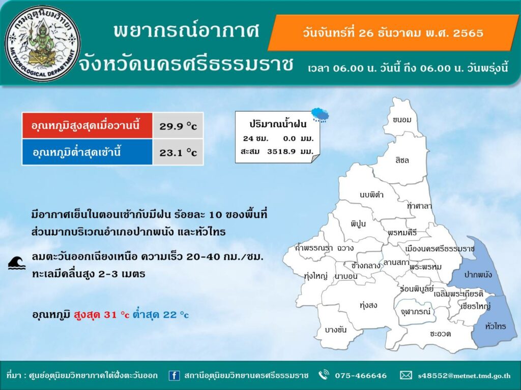 พยากรณ์อากาศ ประจำวันที่ 26 ธันวาคม 2565